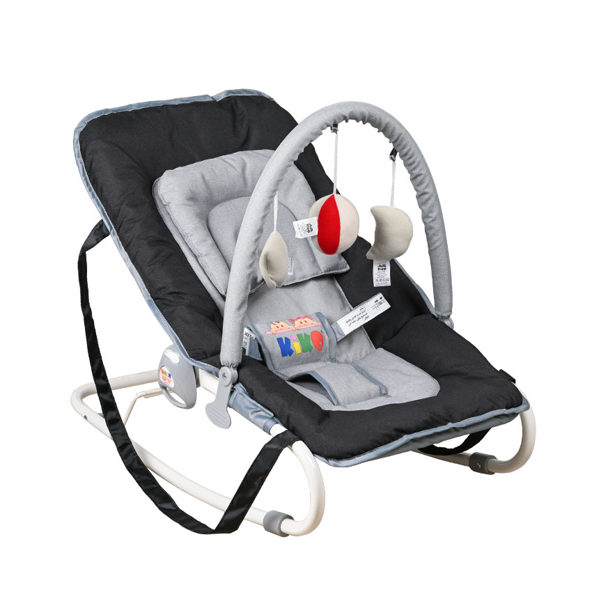 كرسي هزاز للأطفال مع مسند ظهر قابل للتعديل بثلاثة أوضاع: ثابت وهزاز، مزود بمقبض نقل، ولوح ألعاب. قماش قابل للإزالة والغسل.